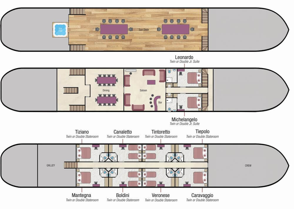 She has two upper deck junior suites and eight lower deck staterooms, all air-conditioned and with en-suite facilities, while above there is a huge sun deck with a large canopy and comfortable loungers to relax on and watch the world drift by