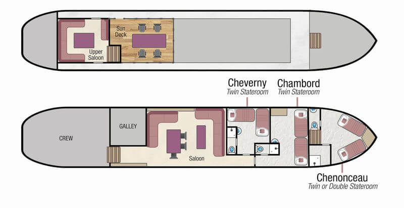 Outside, the sun deck with its comfortable seating offers the perfect vantage point from which to admire the next picturesque waterside village, elegant châteaux, or stunning stretch of scenery as it slowly comes into view. You will even get to cruise through the arches of probably the most-photographed château in the Loire Valley, Château de Chenonceau – not once, but twice – a rare privilege afforded to very few boats! And if you wish to explore the River Cher’s towpath and surrounding countryside, there are 6 bicycles available for your use.