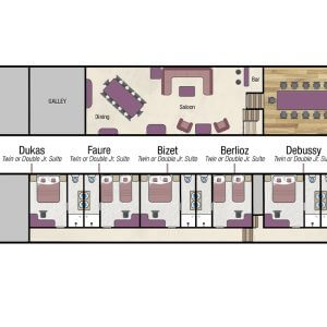 The cabin accommodation comprises six generously-sized junior suites which can be in twin or double-bedded configuration. All the en suite bathrooms have twin hand-basins and oversized showers.